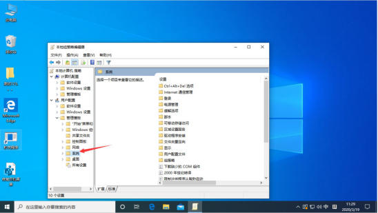 待本地组策略编辑器弹出后,在左侧边栏依次点击“用户配置”、“管理模板”、“系统”;