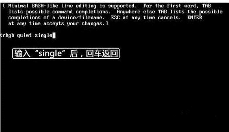 3、然后在编辑界面rhgb quiet后面加“空格”,然后键入“single”,或者直接输入数字的“1”并回车确定。
