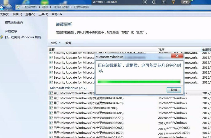 找到Microsoft Windows,顶部以安装时间进行排序(默认即可),找到最接近于现在日期更新的程序(确切的讲,是找到打印机突然不能打印的那个日期更新的微软程序)。