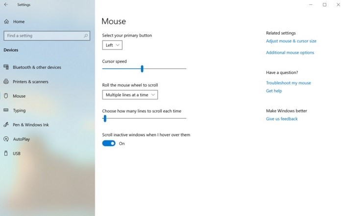 Windows 10 Version 2004下,用户可更快地找到鼠标的光标设置选项而无需打开控制面板:通过“设置->设备->鼠标”即可调节光标移动的速度。