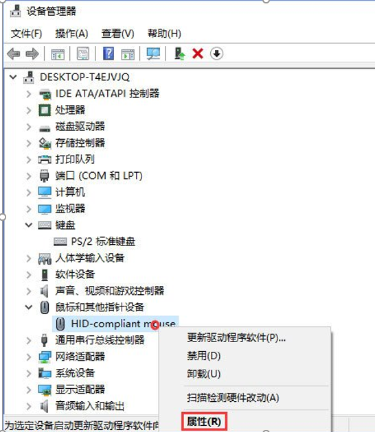 4、接着,在设备管理器中展开【鼠标和其他指针设备】,在下面我们可以看到【HID-compliant mouse】,在该设备上单击右键,在弹出的菜单中点击【属性】;