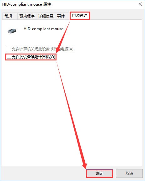 5、切换到【电源管理】选卡,同样将【允许此设备唤醒计算机】的勾选去掉,点击【确定】即可;