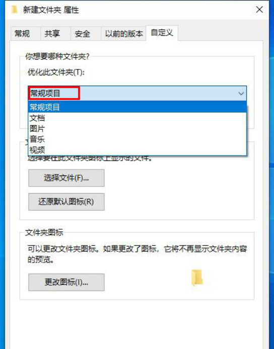 我们在新建文件夹属性界面中,我们点击“自定义”,将优化此文件夹从视频修改为“常规项目”就可以解决问题了。