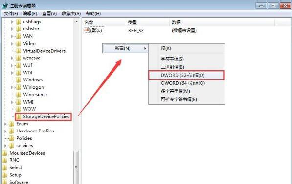 5、在新建的StorageDevicePolicies右侧点击空白处,【右键】-【新建】-【DWORD(32-位)值(D)】并命名为【WriteProtect】;