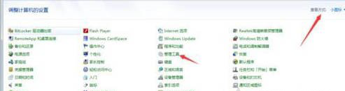 3、进入控制面板,选择左上角的查看放松为小图标,然后下方列表中找到管理工具打开。如下图所示: