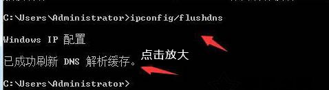 7、然后在命令行输入ipconfig/flushdns,命令点击回车键,看是否刷新成功DNS。问题已经解决。如下图所示: