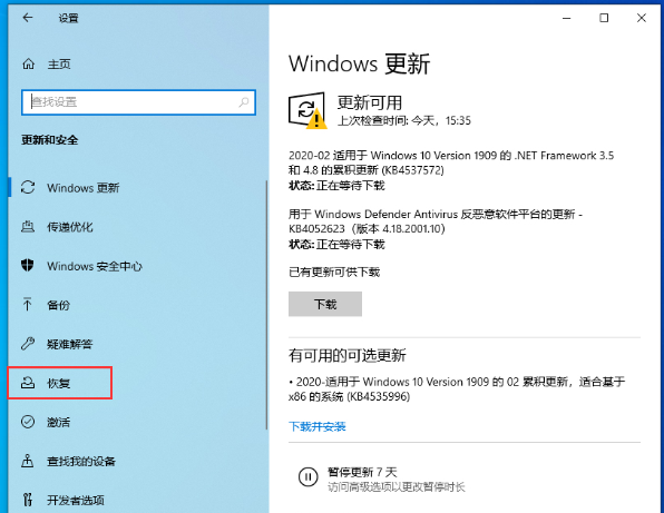接着,在右侧展开的窗口中找到“回退到Windows10上一个版本”,并点击“开始”;