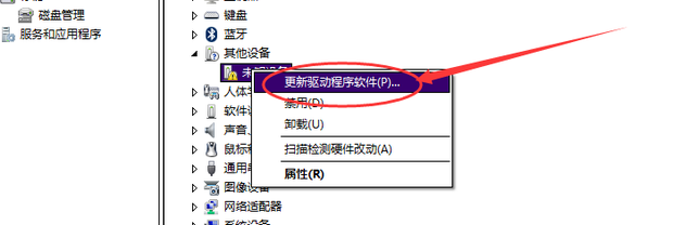 右键点击”其他设备“中的设备并选择”更新驱动程序软件“。