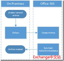 从上图可以看出,整个步骤有两次DirSync,第一次是告诉Office365为用户建立归档文件夹。第二次是将msExchArchiveStatus属性(创建成功则置为1)返回给内部邮箱。事后可以通过Get-Mailbox | fl *arch*命令验证这个属性值。