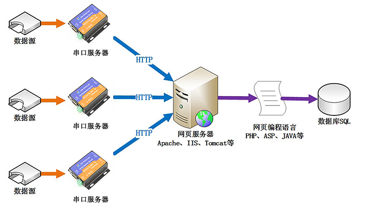 1、串口转http:发给串口服务的数据转为http方式直接提交给网页服务器(如:apache、IIS、tomcat等),通过脚本语言(如:PHP、ASP等)就可以处理,完成数据存储,这样就省去了开发TCP/UDP Server服务器程序的过程,提高了开发速度;