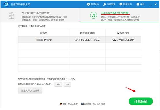 1.请在下载运行互盾苹果恢复大师后,选择“从iTunes备份文件恢复”,在软件识别iTunes备份数据后,点击“开始扫描”按钮。