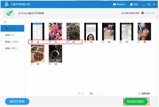 2.扫描后,软件界面中将出现“图片、微信”等手机数据,这里请选择“图片”,在软件界面的右侧勾选需要恢复的图片,然后点击下方的“恢复选中图片”按钮即可恢复苹果手机照片。