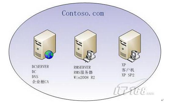 我们完成RMS服务器的部署后,就要来测试一下RMS的表现了。我们先来试试RMS对文件的保护,看看能否用RMS阻止重要文件的内容。我们对RMS的预期是,RMS可以阻止文件在公司之外被打开,文件可以被禁止复制,打印及经过电子邮件转发。实验拓扑如下图所示,RMSERVER已经部署了AD RMS角色,DCSERVER将临时客串一下文件服务器,XP是用于测试的客户机机,XP上已经安装了Office2007。