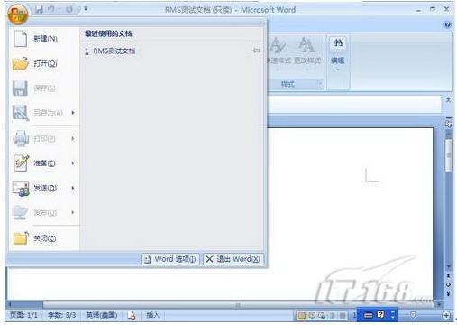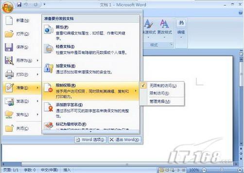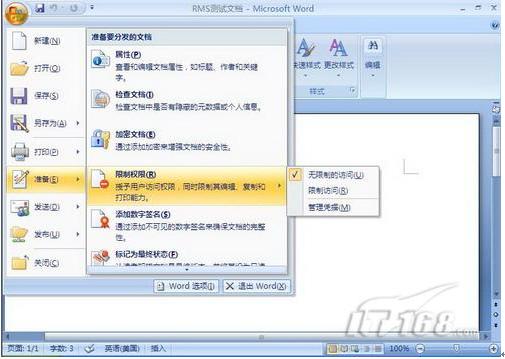 XP客户机上必须安装RMS客户端软件,才可以发挥RMS的作用。RMS客户端软件的下载地址我们就不为大家提供了,为什么,因为Office2007可以自动下载。在XP客户机上打开Word2007,如图1所示,点击Word2007左上角的Office按钮,依次点击“准备”-“限制权限”-“限制访问”。