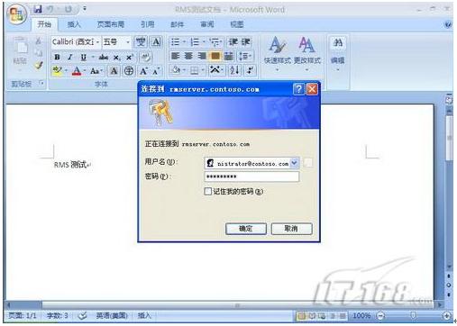 Jack登录后,打开域控制器上DOC共享文件夹中的测试文件,如图11所示,RMS客户端自动使用HTTPS协议连接到RMS服务器。RMS服务器要求访问者进行身份验证,我们输入Jack的身份凭证进行身份验证,用户名最好输入Jack@contoso.com。