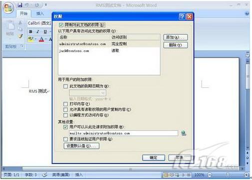 Administrator通过身份验证后,看到了如图8所示的RMS权限设置界面,我们为Jack设置了读取权限。注意,描述Jack时需要使用电子邮件地址Jack@contoso.com。如果我们希望对Jack进行更详细的权限设置,我们可以点击左下角的“其他选项”。