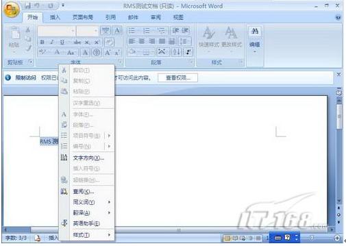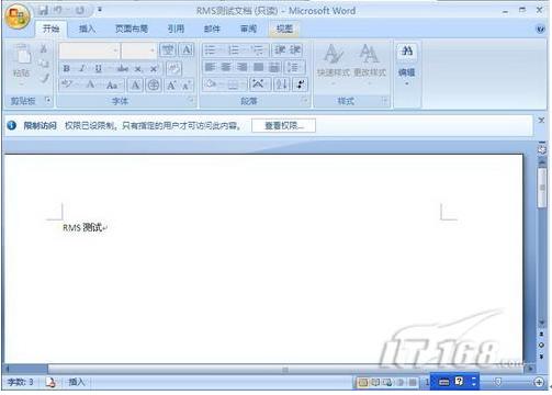以administrator的身份在XP客户机上登录,打开DOC共享文件夹中的测试文件,如图6所示,在Word2007中点击“限制访问”。