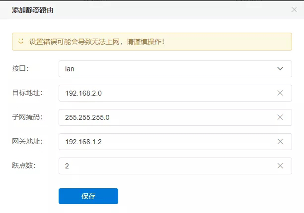 A路由要想访问B路由下面lan口的电脑,也就是访问192.168.2.0这个ip段,就需要添加一条为192.168.2.0 255.255.255.0 192.168.1.2的静态路由,分别是目的地址,子网掩码,对方路由网关。