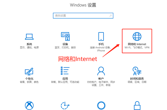 2、在新窗口中点击「网络和Internet」。