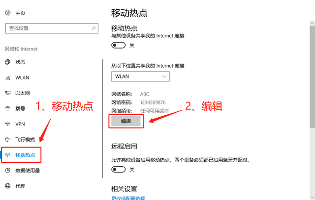 3、点左边菜单栏中的「移动热点」,再点右边的「编辑」。