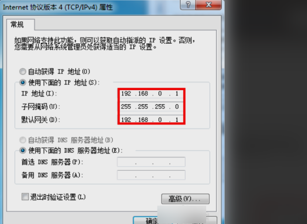 2、然后将“使用下面的IP地址”选中,并按照图中标识分别设置IP地址/子网掩码/默认网关,点击确定。