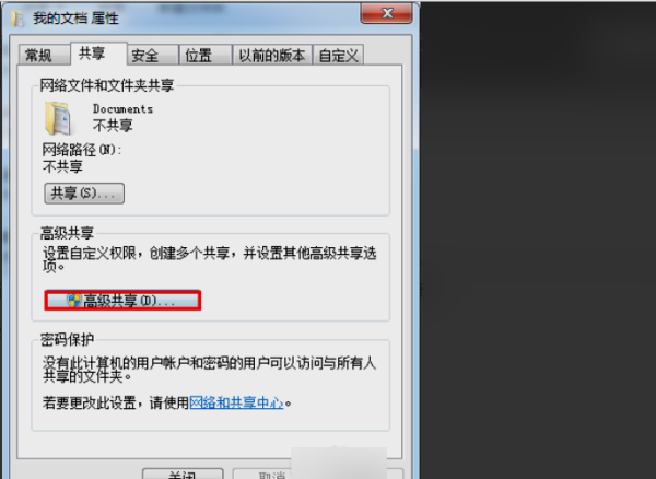 4、然后选择要共享的文件,右键单击“属性”,在弹出的对话框中选择“高级共享”。