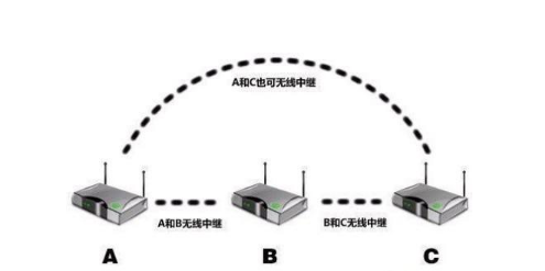 A----B----C,共三个站点,假如A与B可以无线桥接,B与C也可以无线桥接,但A与C因距离远不能无线桥接。