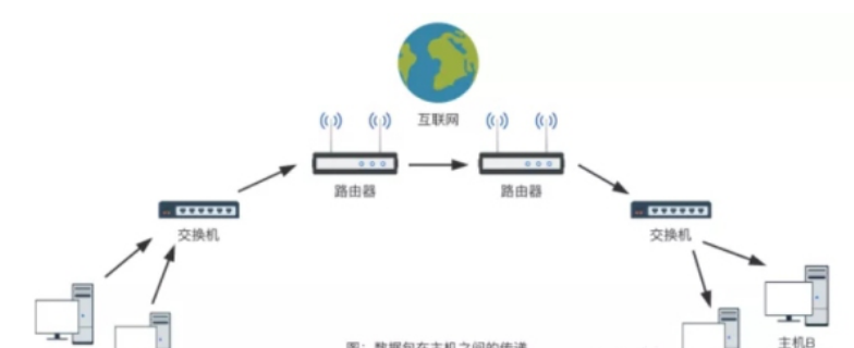 如图所示,主机A向主机B发送数据包,需要经过交换机、路由器等设备。但在物理层(OSI 模型的第 1 层),还需要调制解调器和中继器。