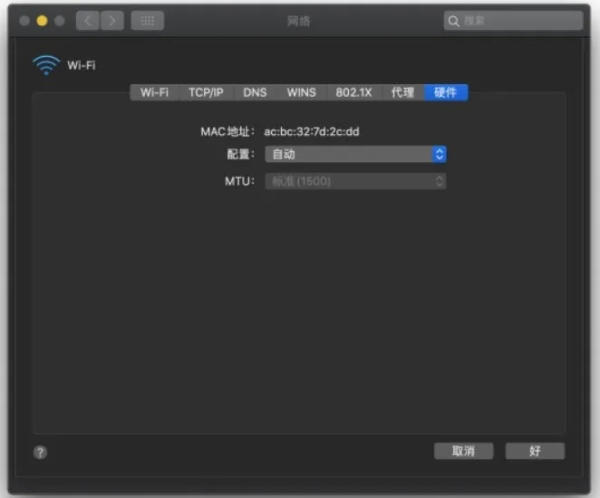 如下图所示,Mac 电脑可以在「系统偏好设置 - 网络 - Wi-Fi - 高级 - 硬件」查看当前计算机的 MAC 地址。
