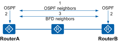 BFD在两台网络设备上建立会话,用来检测网络设备间的双向转发路径,为上层应用服务。BFD本身并没有邻居发现机制,而是靠被服务的上层应用通知其邻居信息以建立会话。会话建立后会周期性地快速发送BFD报文,如果在检测时间内没有收到BFD报文则认为该双向转发路径发生了故障,通知被服务的上层应用进行相应的处理。下面以OSPF与BFD联动为例,简单介绍会话工作流程。