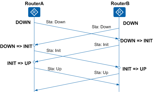 BFD会话有四种状态:Down、Init、Up和AdminDown。会话状态变化通过BFD报文的State字段传递,系统根据自己本地的会话状态和接收到的对端BFD报文驱动状态改变。BFD状态机的建立和拆除都采用三次握手机制,以确保两端系统都能知道状态的变化。以BFD会话建立为例,简单介绍状态机的迁移过程。