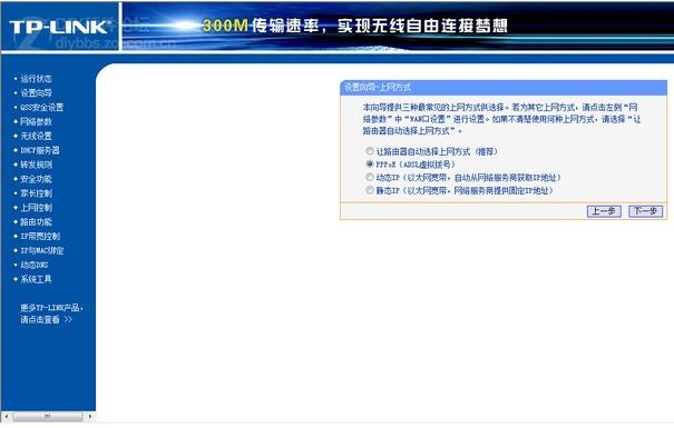 4、我们家里使用的,一般都是ASDL拨号上网,所以我们选PPPoE,然后点击下一步。