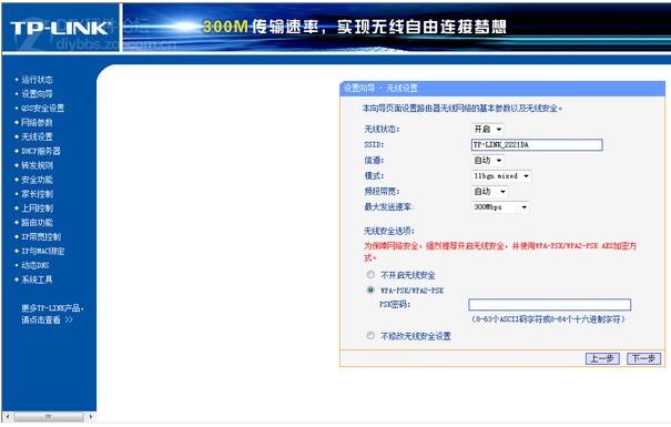 6、SSID这一项就是我们在电脑会手机上联网时候看到的无线名称,改成一个你喜欢的英文ID,强烈建议不要用默认的,下面的无线安全,千万别选不开启无线安全,权责WPA-PSK/WPA2-PSK,然后输入一个你记得住的尽可能复杂的密码,最好不要都是数字加一些英文和标点符号什么的。接下来,点击下一步