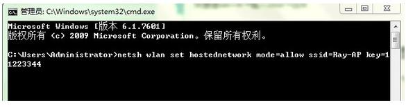 运行命令:netsh wlan set hostednetwork mode=allow ssid=Ray-AP key=11223344
