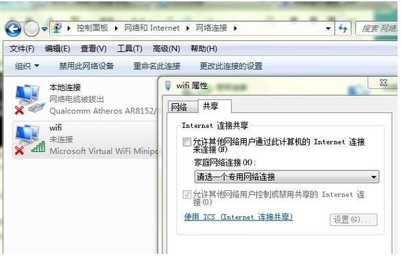 确定之后,提供共享的网卡图标旁会出现“共享的”字 样,表示“宽带连接”已共享至“虚拟WiFi”。
