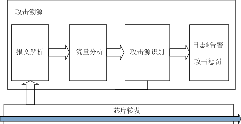 如图1所示,攻击溯源包括报文解析、流量分析、攻击源识别和发送日志告警通知管理员以及实施惩罚四个过程。