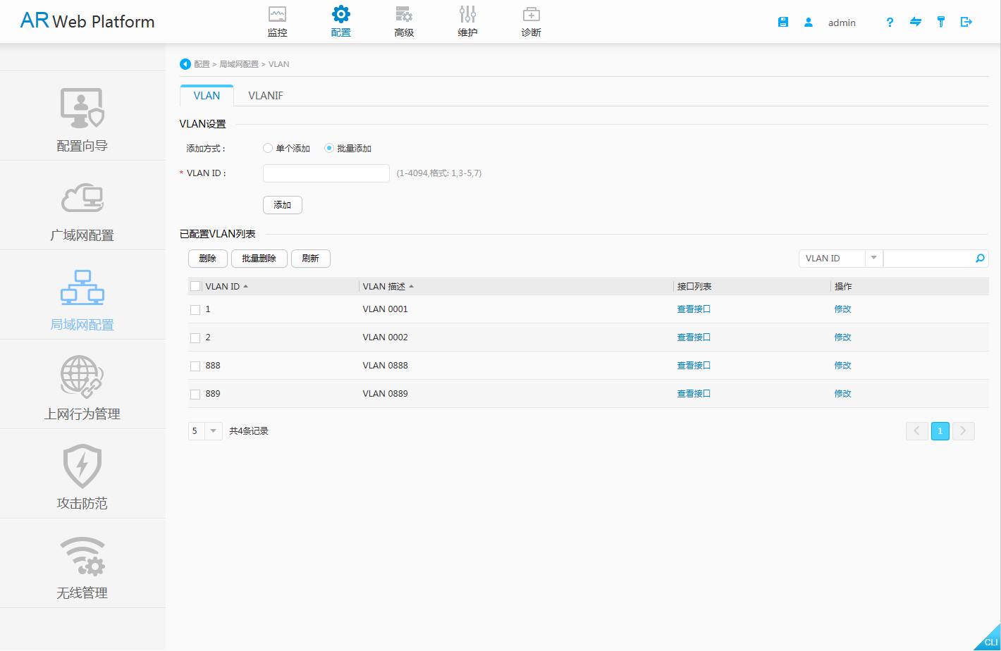 用户通过此功能设置VLAN,并将接口加入VLAN。