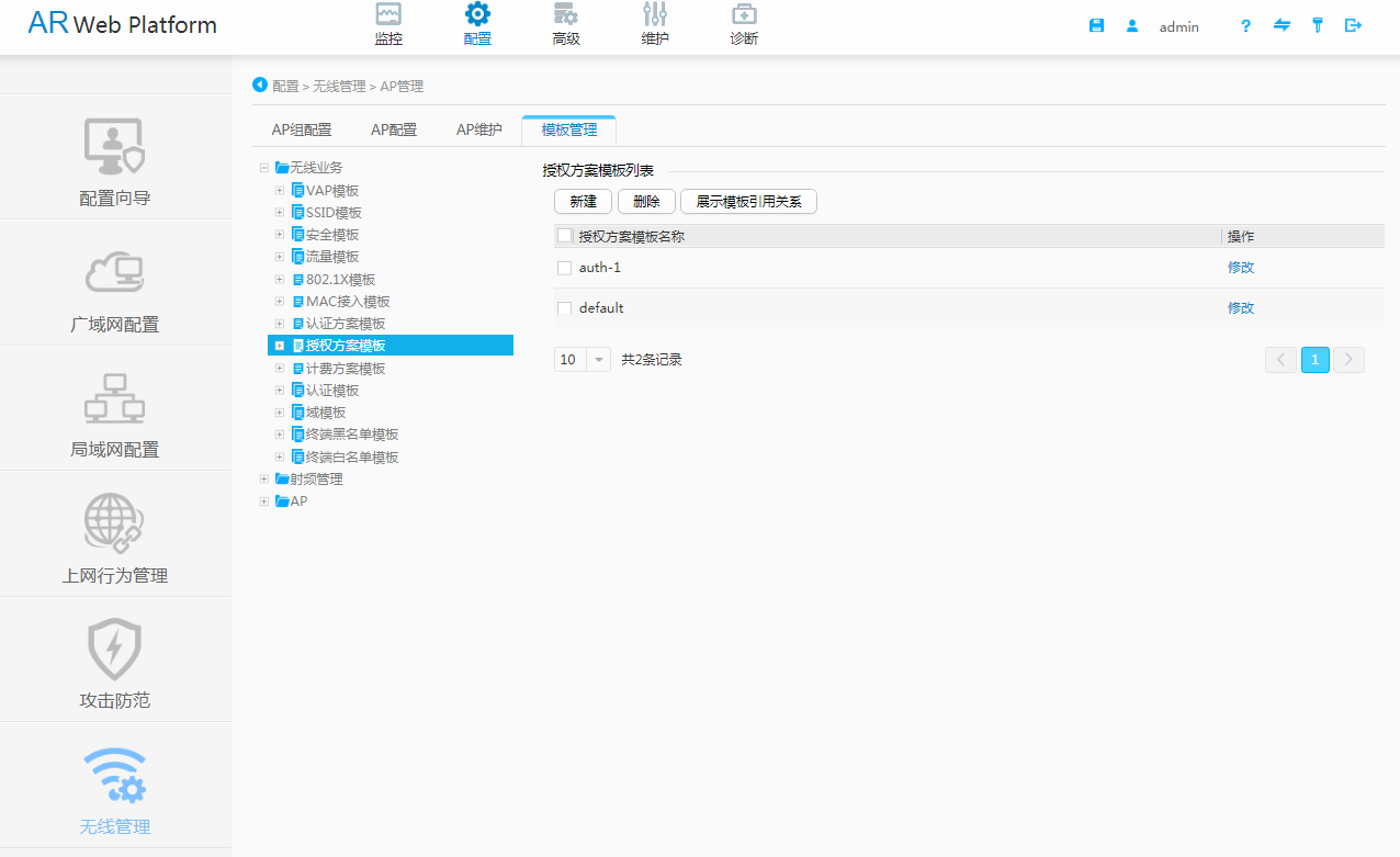 11. 依次单击“配置 > 无线管理 > AP管理 > 模板管理 > 无线业务 > 授权方案模板”,进入“授权方案模板列表”页面,如图1-179所示。