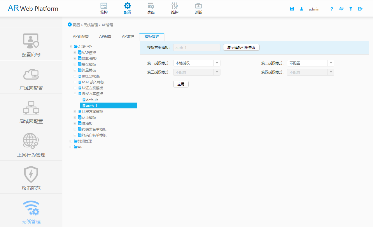 依次单击“配置 > 无线管理 > AP管理 > 模板管理”,进入“模板管理”页面。
