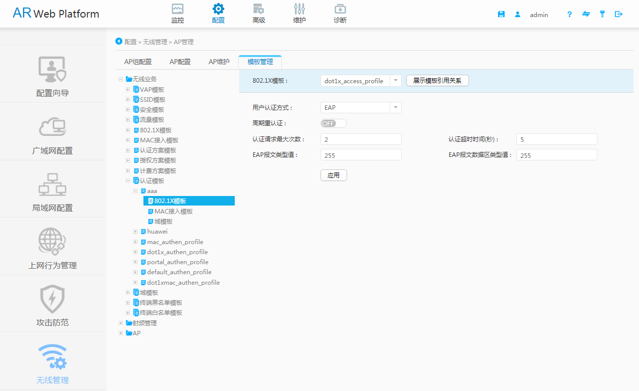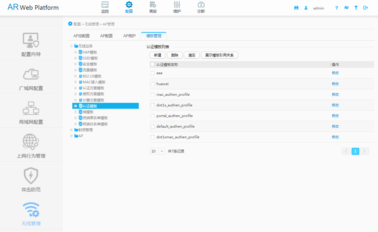 依次单击“配置 > 无线管理 > AP管理 > 模板管理”,进入“模板管理”页面。