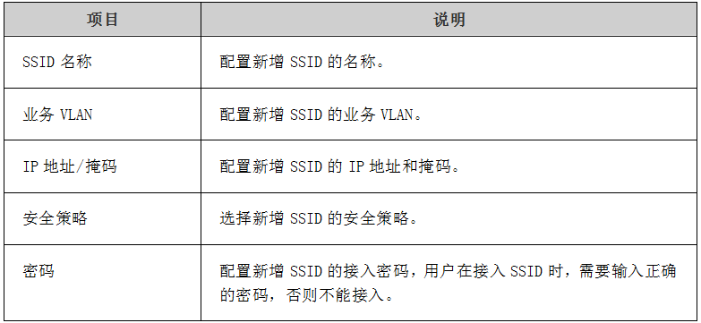SSID用来指定不同的无线网络。在STA上搜索可接入的无线网络时,显示出来的网络名称就是SSID。通过新建SSID然后选择此SSID生效的AP并输入密码实现STA无线接入AP。