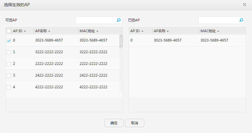 b. 单击“选择生效的AP”后面的“配置”,在弹出的“选择生效的AP”界面勾选一个或者多个AP,如图1-230所示,然后单击“确定”。