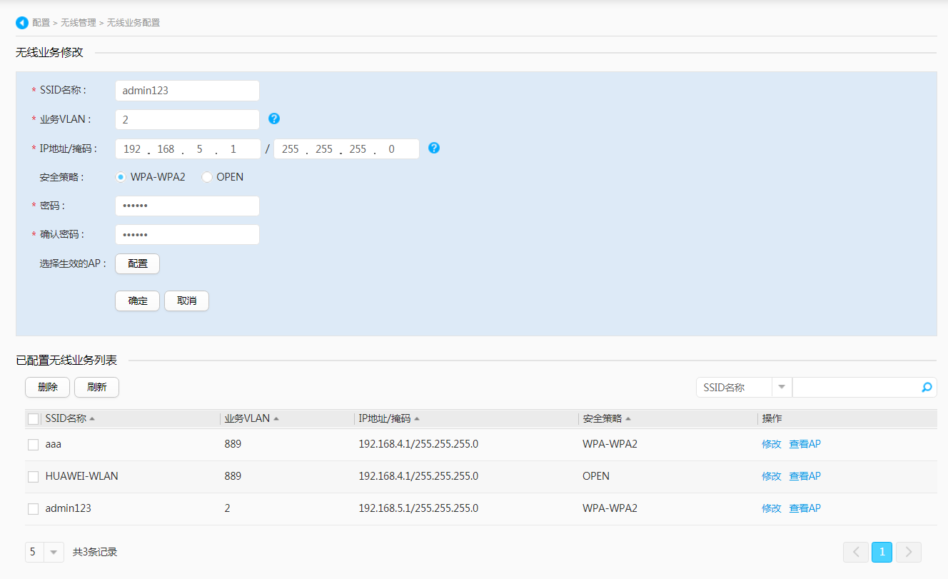 也可按照“业务VLAN”、“IP地址/掩码”、“安全策略”来进行搜索对应的无线业务。搜索出对应无线业务后,可以对其进行查看、修改、删除操作。