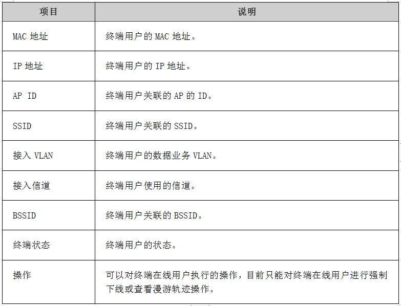 在终端用户管理界面可查看在线的、离线的终端用户的MAC地址、IP地址等信息。