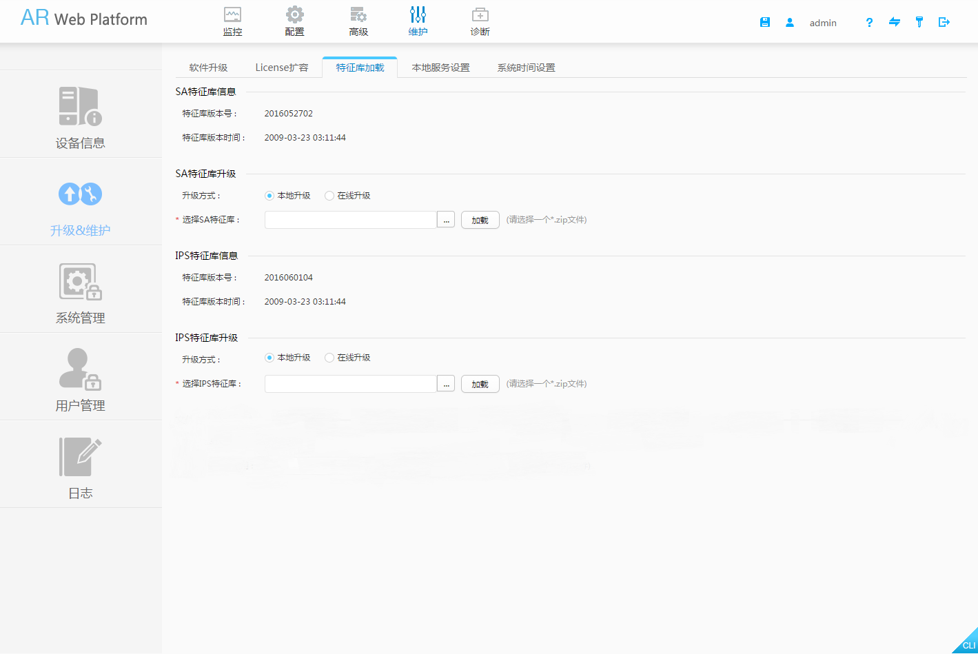 1. 依次选择“维护 > 升级&维护 > 特征库加载”,进入特征库加载界面,如图1-265所示。