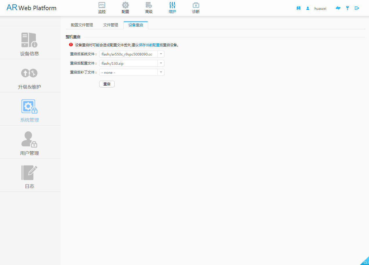 1. 选择“维护 > 系统管理 > 设备重启”。如图1-286所示。