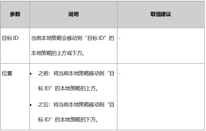 移动本地策略可以在安全区域内调整本地策略的位置,从而改变本地策略的匹配顺序。位置越高的本地策略优先级越高,越优先进行匹配。
