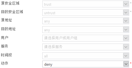 缺省情况下,Trust-Untrust域间出方向的缺省包过滤策略为deny,如果之前已经配置了permit请注意配置此步骤。
