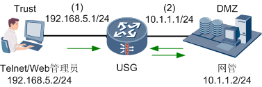 如图7-29所示,只允许192.168.5.2/24这个IP地址通过Telnet或Web方式登录设备;另外网管需要与设备进行交互,网管接收设备上报日志告警、向设备下发配置等。