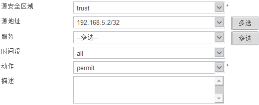 1. 配置Telnet/Web终端所在安全区域到Local域的本地策略,只允许192.168.5.2访问,且只能通过Telnet和HTTP协议访问。